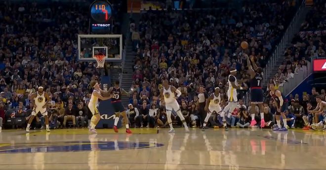 第二节进入到最后4分钟,哈登再次开启得分模式,反击中一步过掉霍福德,库里只能赔上犯规,登哥两罚全中。