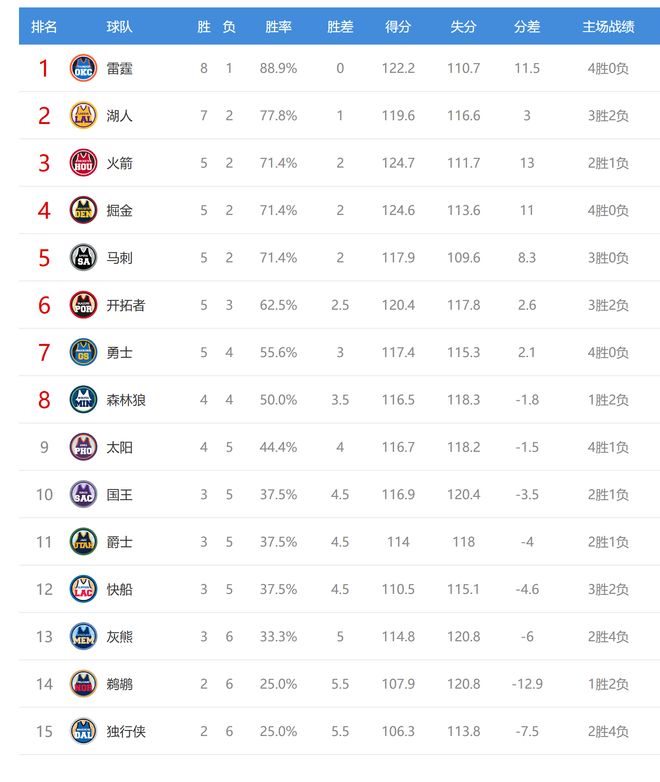 今日比赛后西部最新排名如下: