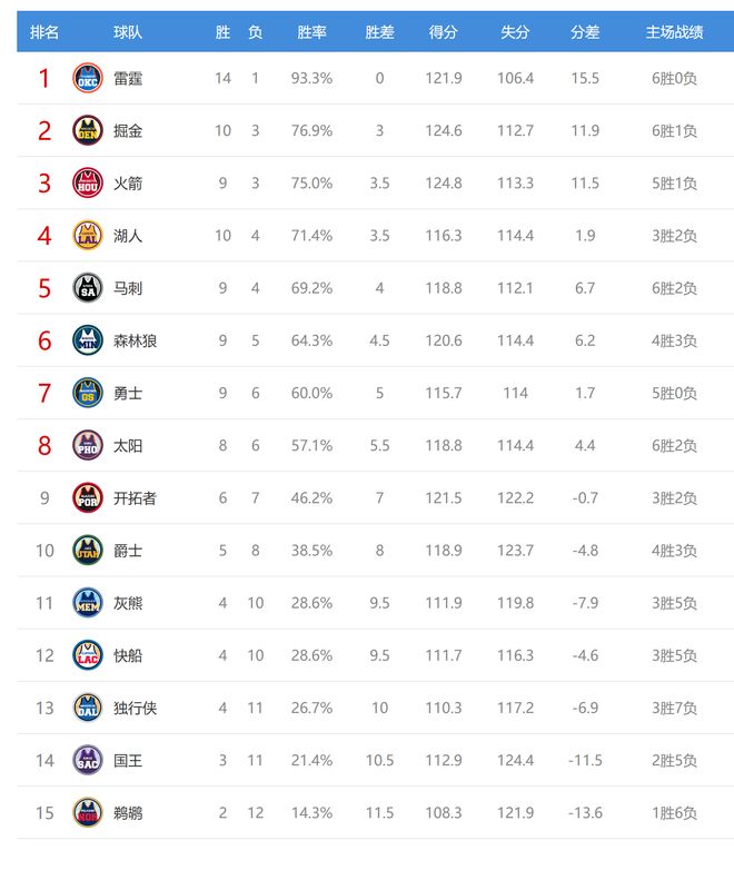 今日比赛后西部球队中只有快船、灰熊排名互换,其他球队排名不变。