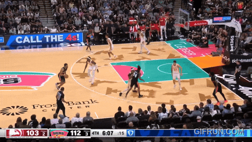 然后是全场最精彩两回合:索汉给尚佩尼递手,尚佩尼突破壮丽扣篮;下一回合,一模一样的套路,鹰夹尚佩尼,索汉内切扣篮。