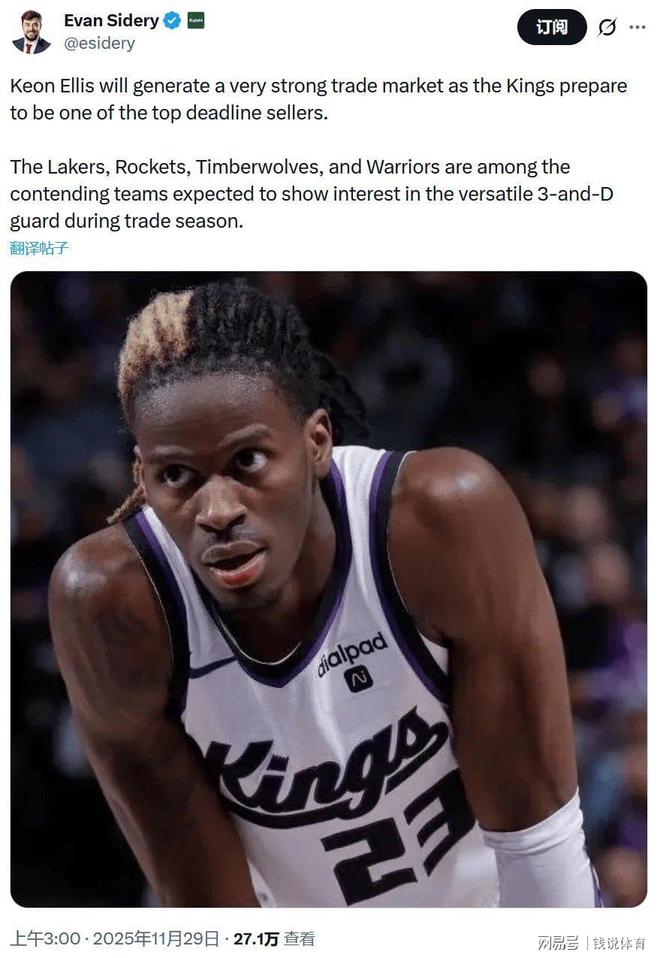 Evan Sidery在报道中明确指出,国王队大概率会在交易截止日前积极兜售埃利斯,这位年轻后卫的市场行情有望掀起一股抢购热潮。